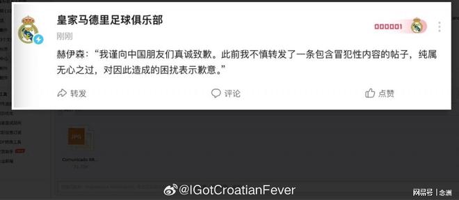 然而迄今为止,所谓道歉只出现皇马官方微博上,官网和外国社媒账号都没有,赫伊森本人的任何账号也都没有同步,属于“中国特供”,而且限制评论,继续引发争议。
